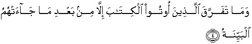 4. Dan tidaklah berpecah belah orang-orang yang didatangkan Al Kitab (kepada mereka) melainkan sesudah datang kepada mereka bukti yang nyata.