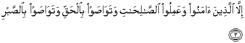 3. kecuali orang-orang yang beriman dan mengerjakan amal saleh dan nasehat menasehati supaya mentaati kebenaran dan nasehat menasehati supaya menetapi kesabaran.